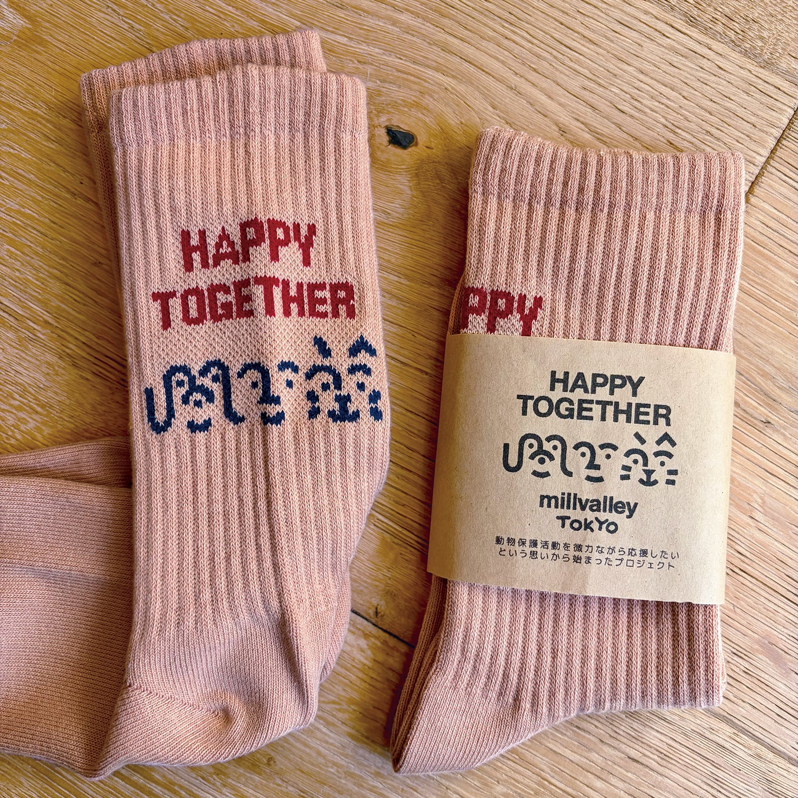 イラストレーター青木謙吾さんの描き下ろしアートがかかとに編み込まれたHAPPY TOGETHER PROJECT靴下です。程よい厚みで柔らかく履き心地がとてもよい靴下はオールシーズン履いていただけます。このアイテムをご購入いただいて得られる利益は私たちが応援している動物愛護団体へ全額寄付されます。