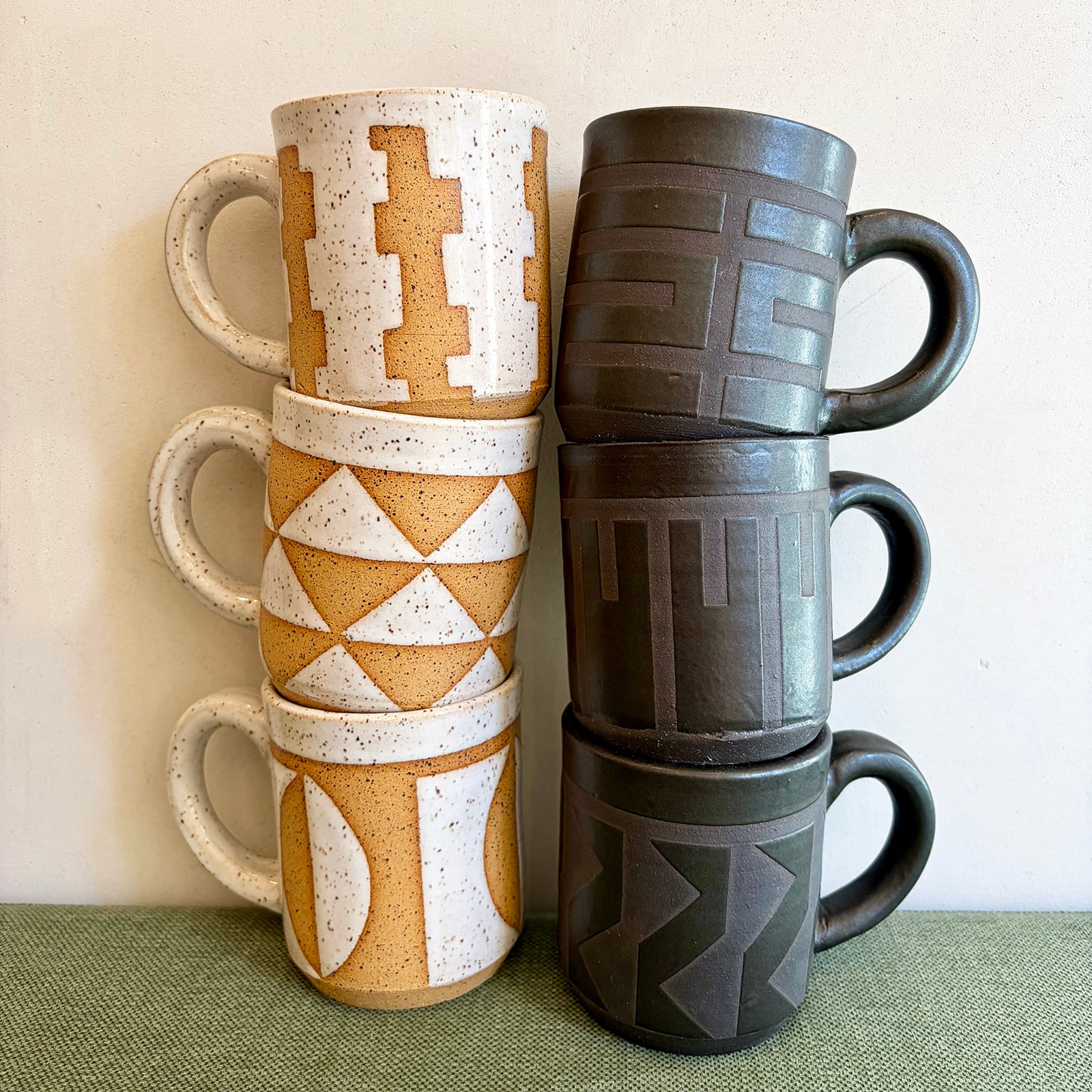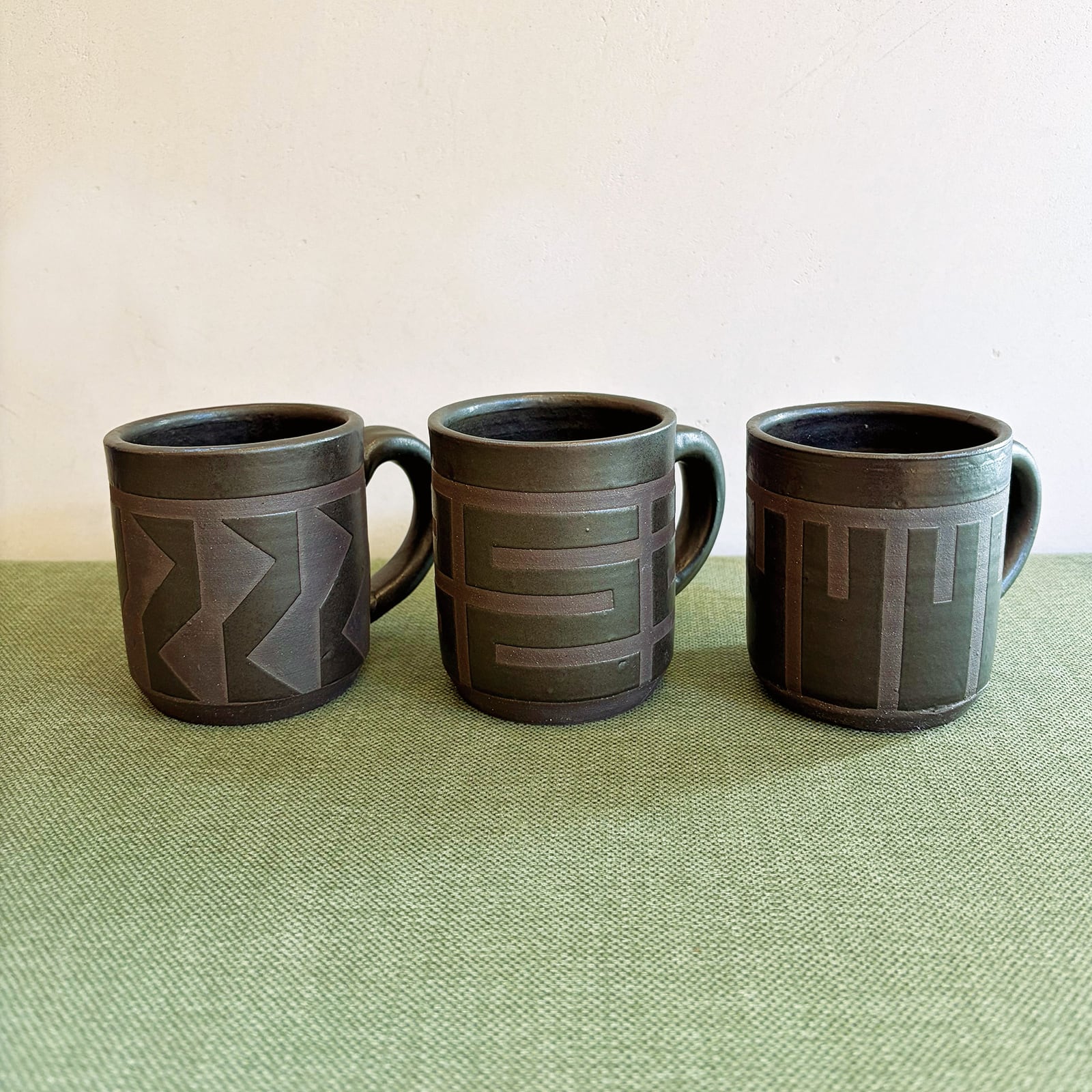 CaliforniaのJoshua Treeをベースに創作活動をする陶芸作家Brian Bosworthによる陶器《bkb ceramics》のマグ。ブラックのトーン・オン・トーンで表現された幾何学模様が魅力。全てhand madeのためひとつずつ厚みや大きさも微妙に違います。とても丈夫で、電子レンジ、食洗機もお使いいただけます。