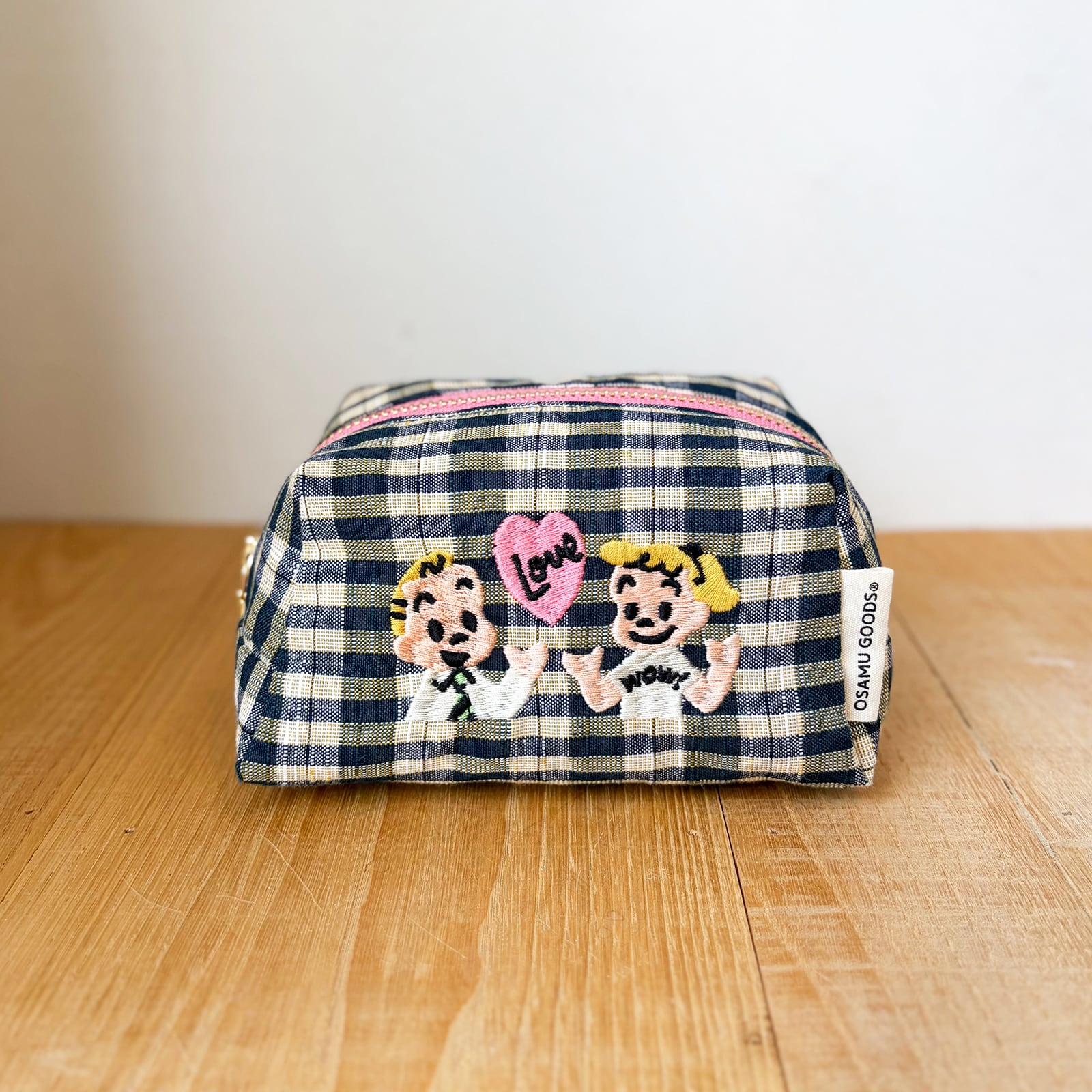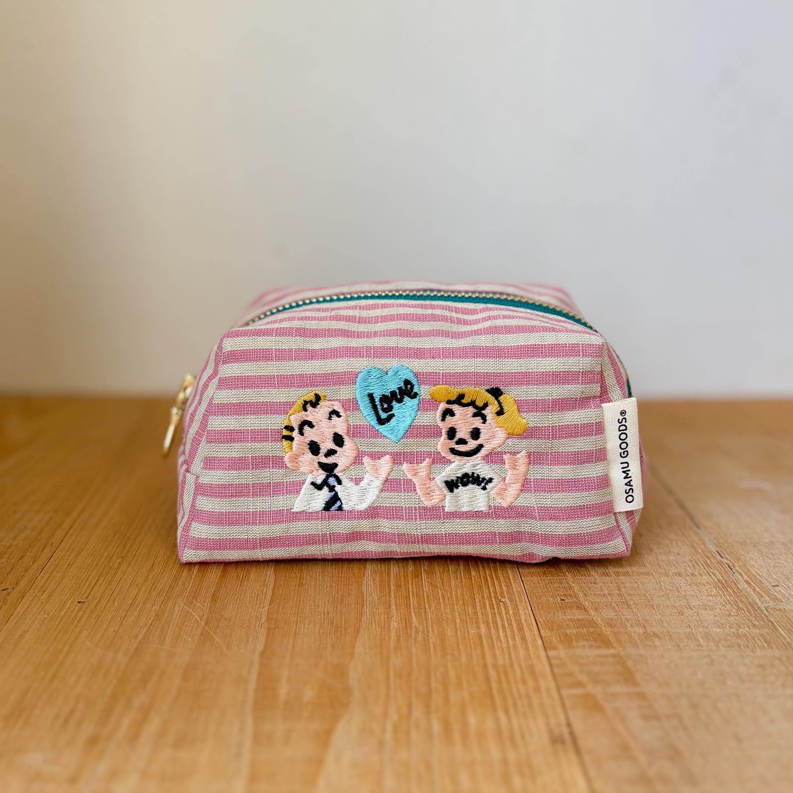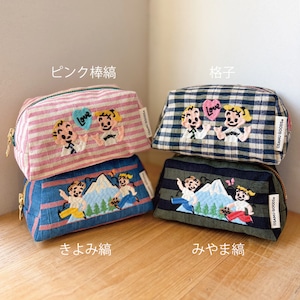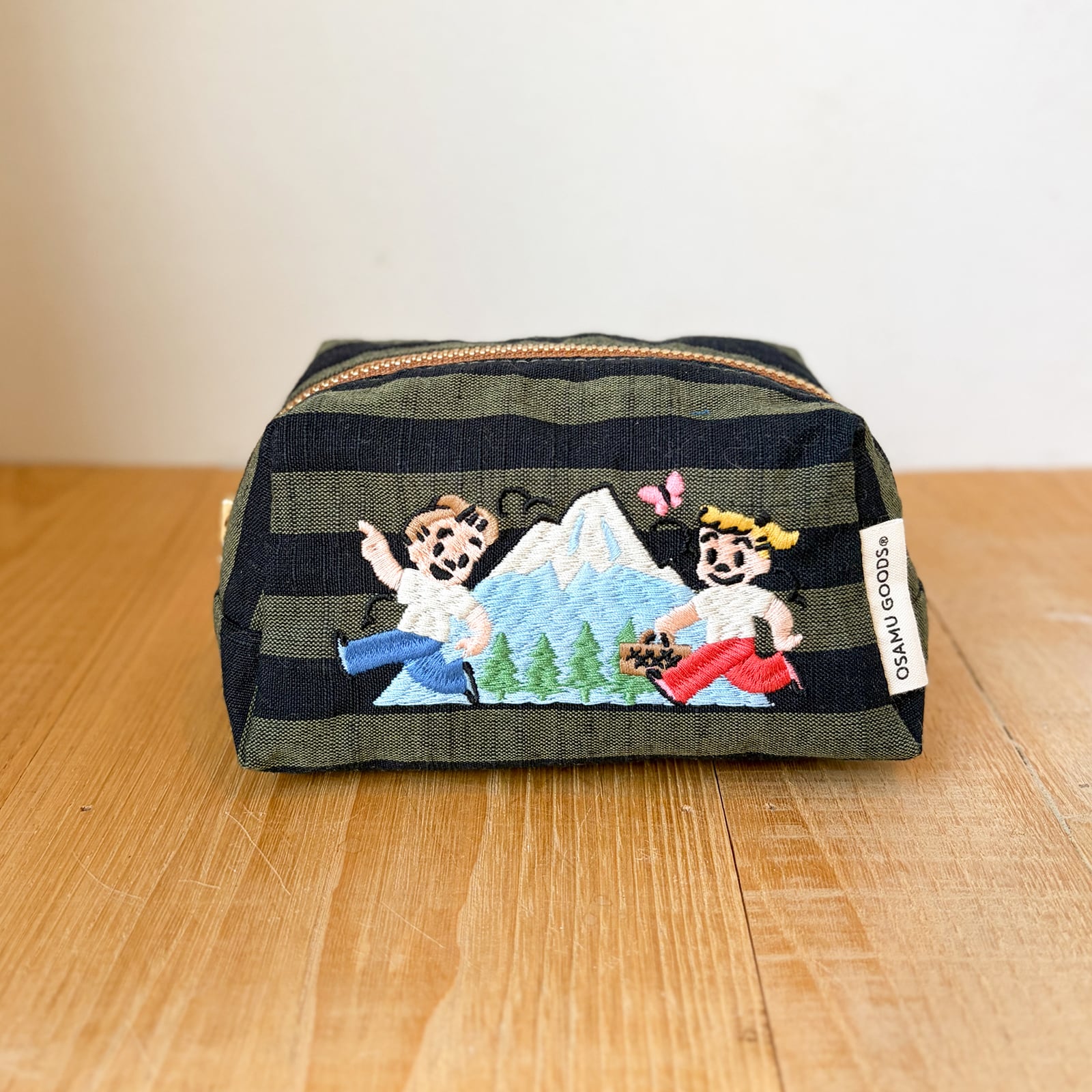 会津木綿の『HARAPPA』の生地を使ったとってもかわいいコラボアイテム『山ポーチ』福島県の会津若松で120年続く工場で熟練の職人によって丁寧に織り上げられた会津木綿を使用したHARAPPAの定番アイテム『山ポーチ』。その山ポーチにオサムグッズのアートを刺繍したかわいいがぎゅっと詰まったアイテム。ころっとした形がかわいくてとっても使いやすいポーチです。