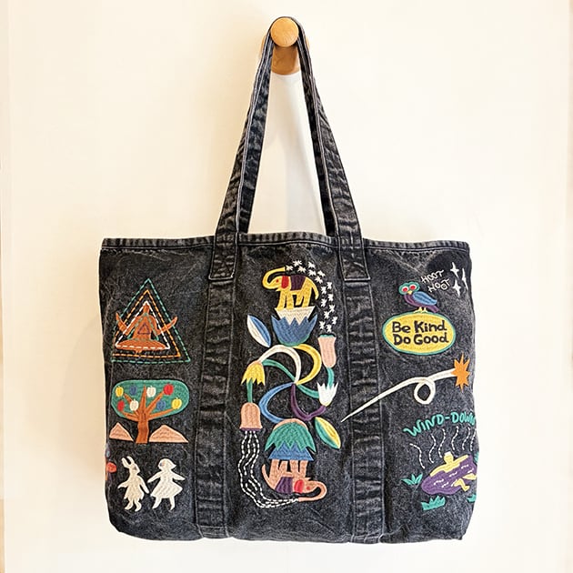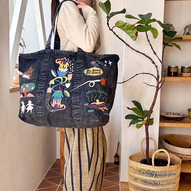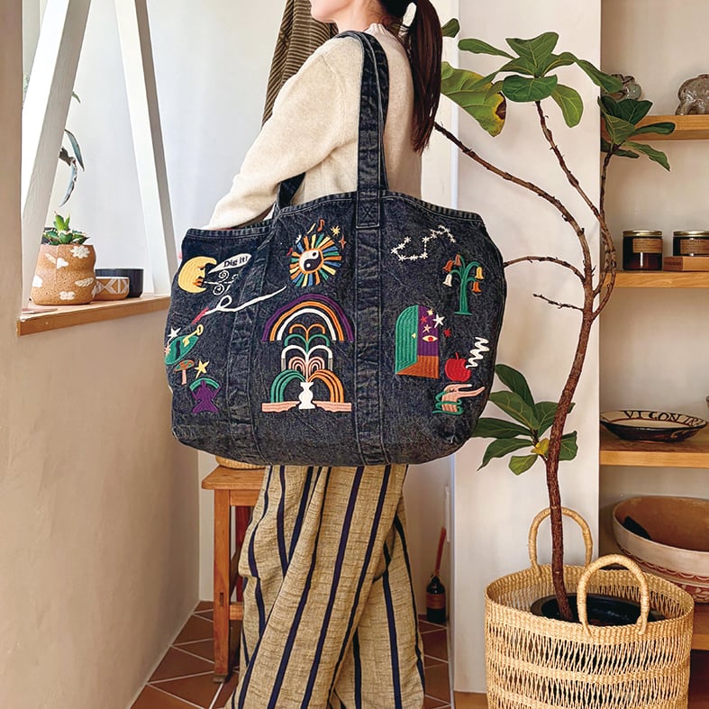 ロサンゼルスを拠点に活躍するアーティスト『lookout & wonderland』のアートが全面に刺繍されたブラックデニムトートです!生デニムに綿糸で刺繍を施しバッグの形に縫製してから製品の状態で洗い加工することで、刺繍糸がふっくらと柔らかくなり、軽い擦れが出て雰囲気が増します。また縫製してから洗うことで自然な “アタリ” が生まれ、デニムの表情がより豊かになります。