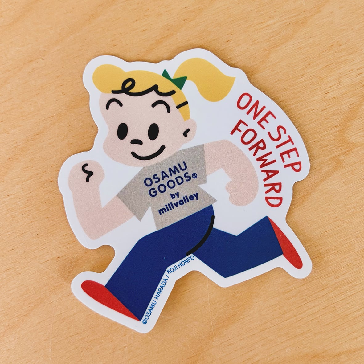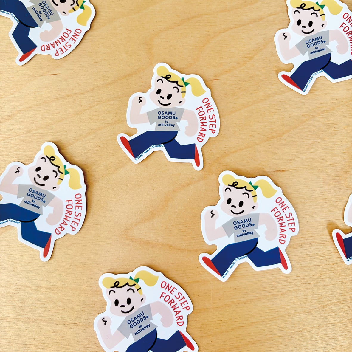 日々の生活の中で、少しでもポジティブな気持ちになれるようなステッカーにという思いから、元気よく前に踏み出している Jill のアートに“ONE STEP FORWARD( 一歩前へ )” のメッセージを添えました。マットな質感でスマホにちょうどいいサイズです!