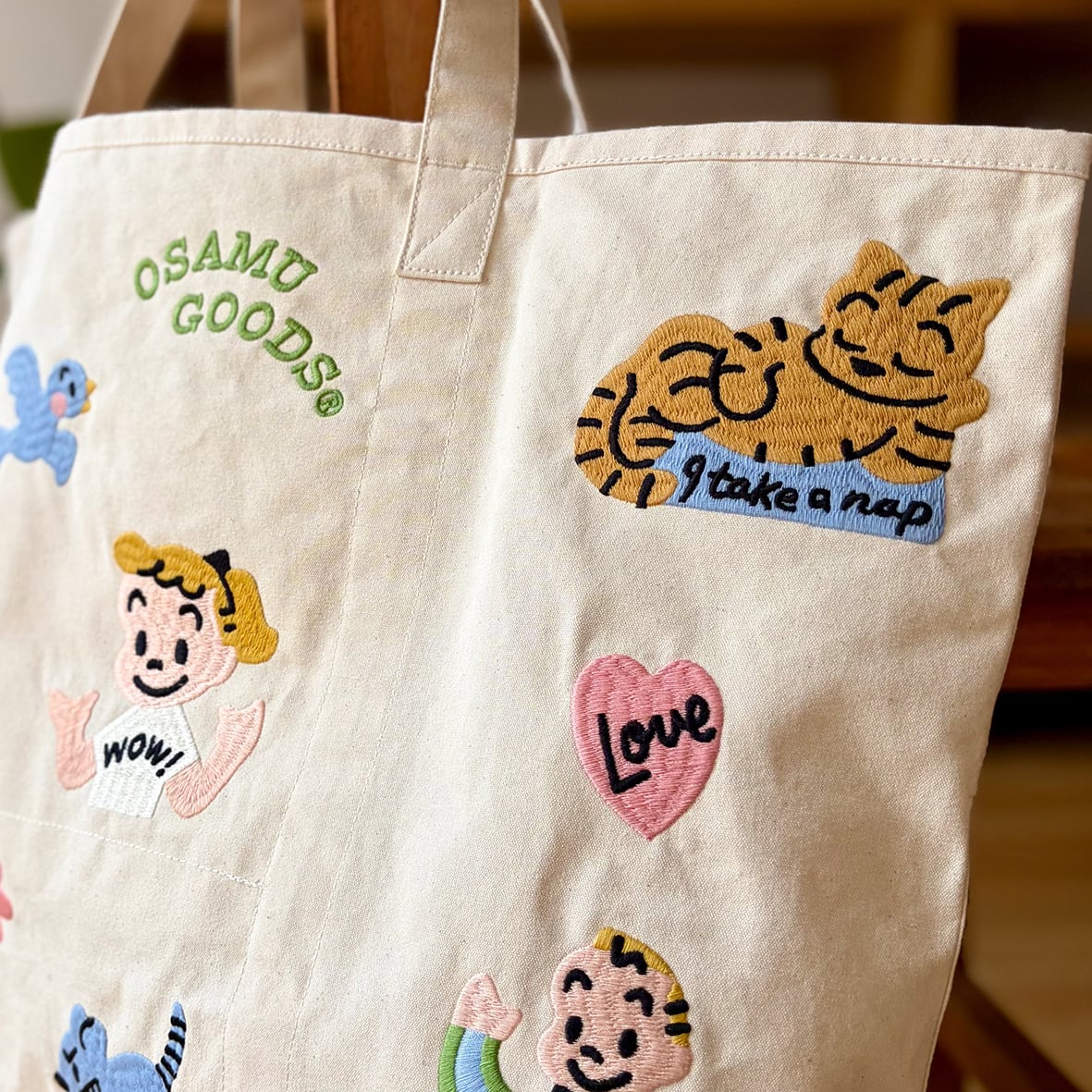 ナチュラルなキャンバスのベースにカラフルでポップなOSAMU GOODS®︎のアートがとても映える軽量で丈夫なトートバッグです。内側にポケットがついているのでスマホがバッグの中で迷子になることもありません。張りのある上質なコットン生地は使い込むほどに柔らかく風合いが増します。ちょっとした旅行も良いサイズ感です。