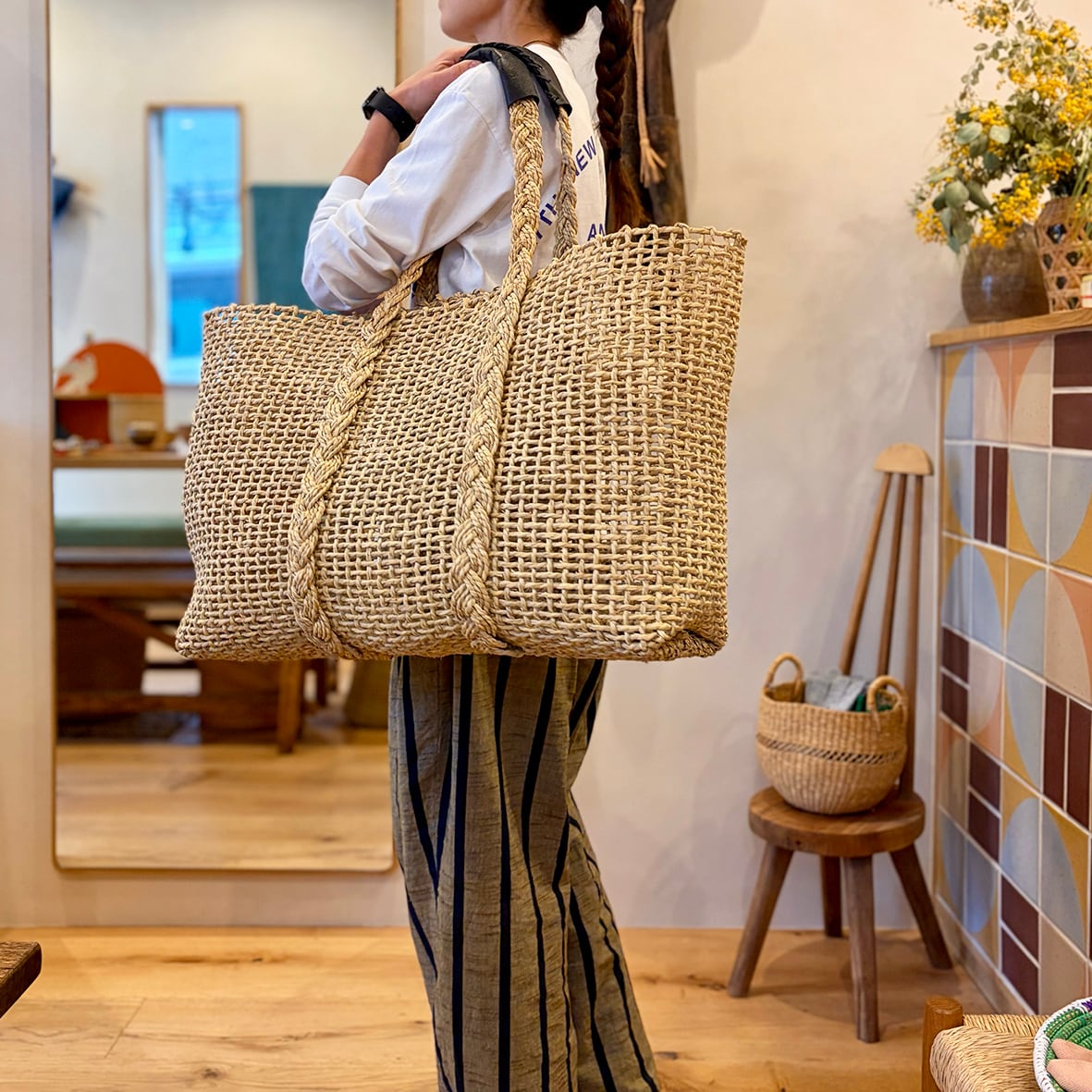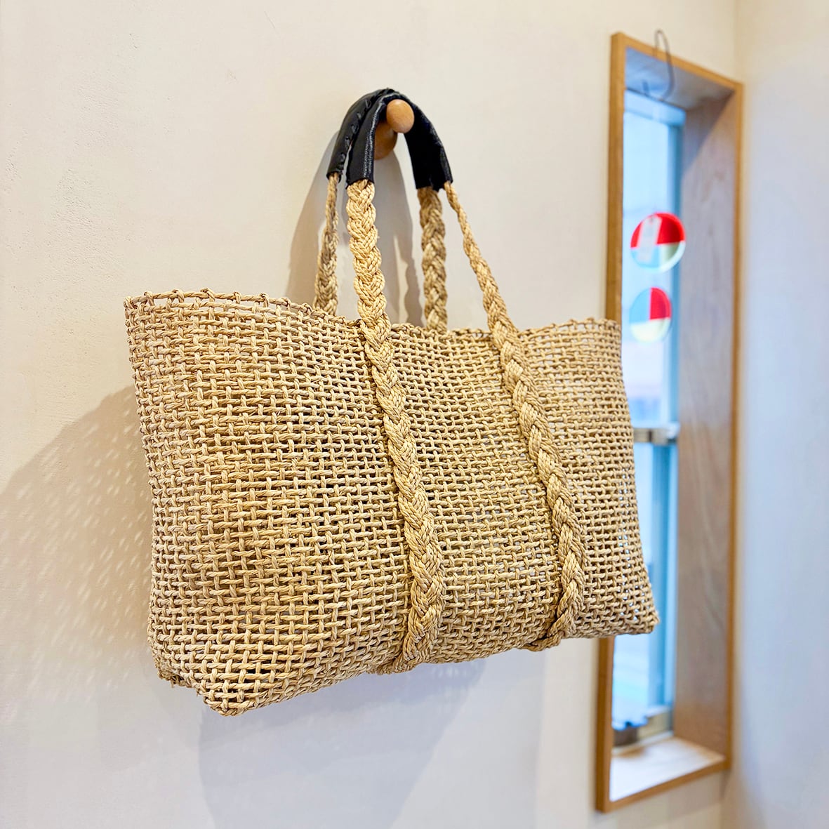岡山県でひとつひとつ手仕事で作られている須浪亨商店のとても大きなカゴバッグ。見た目にも美しい、しっかりと編まれたいぐさのかごはとても丈夫で長く愛用していいただけ、経年変化していく色をお楽しみいただけます。インテリアにしてもとてもかっこいい大きなサイズのバスケットです。ハンドルに巻かれたレザーによってストレスなく肩掛けができ、ブラックレザーのアクセントも効いています。